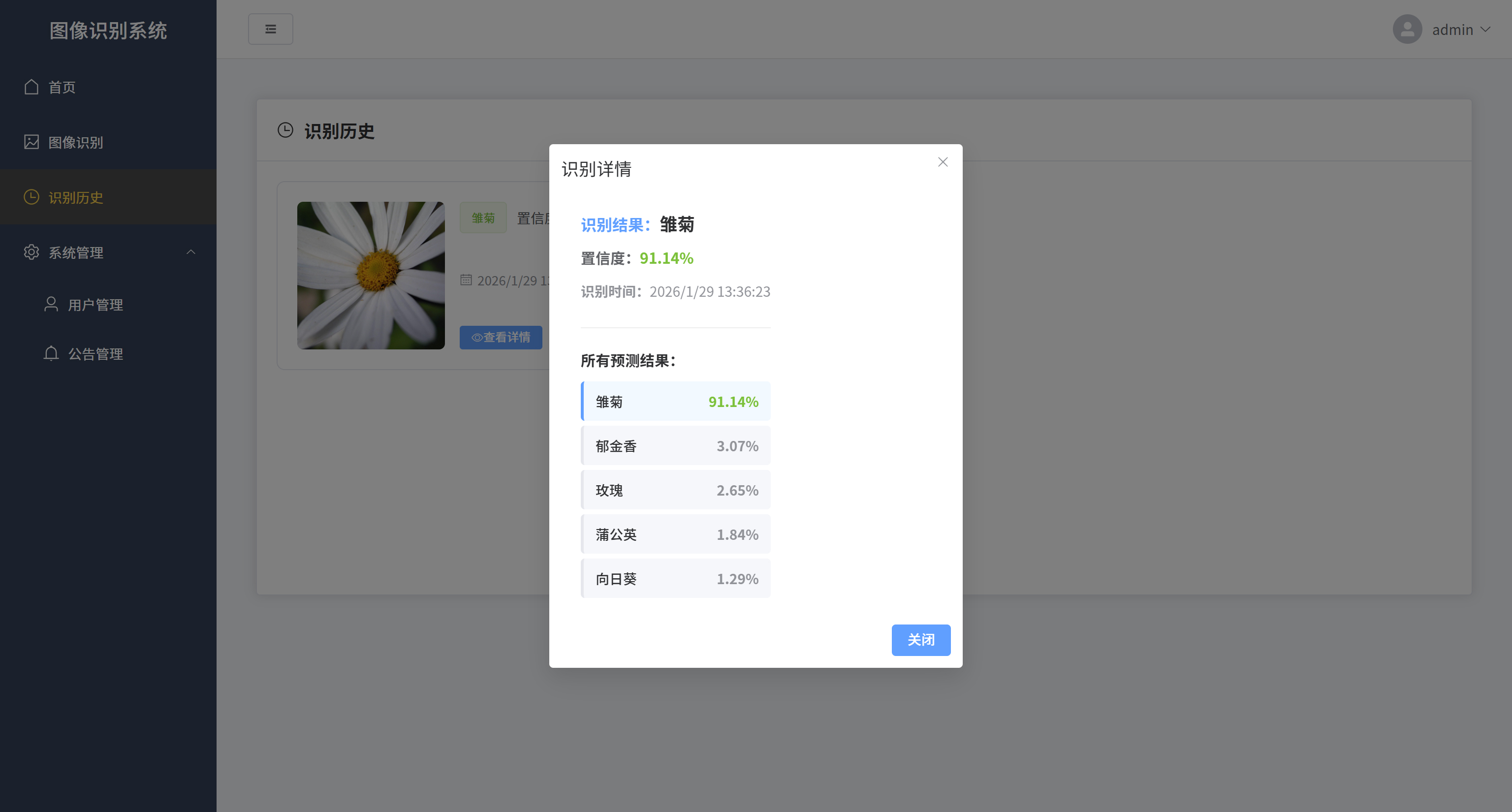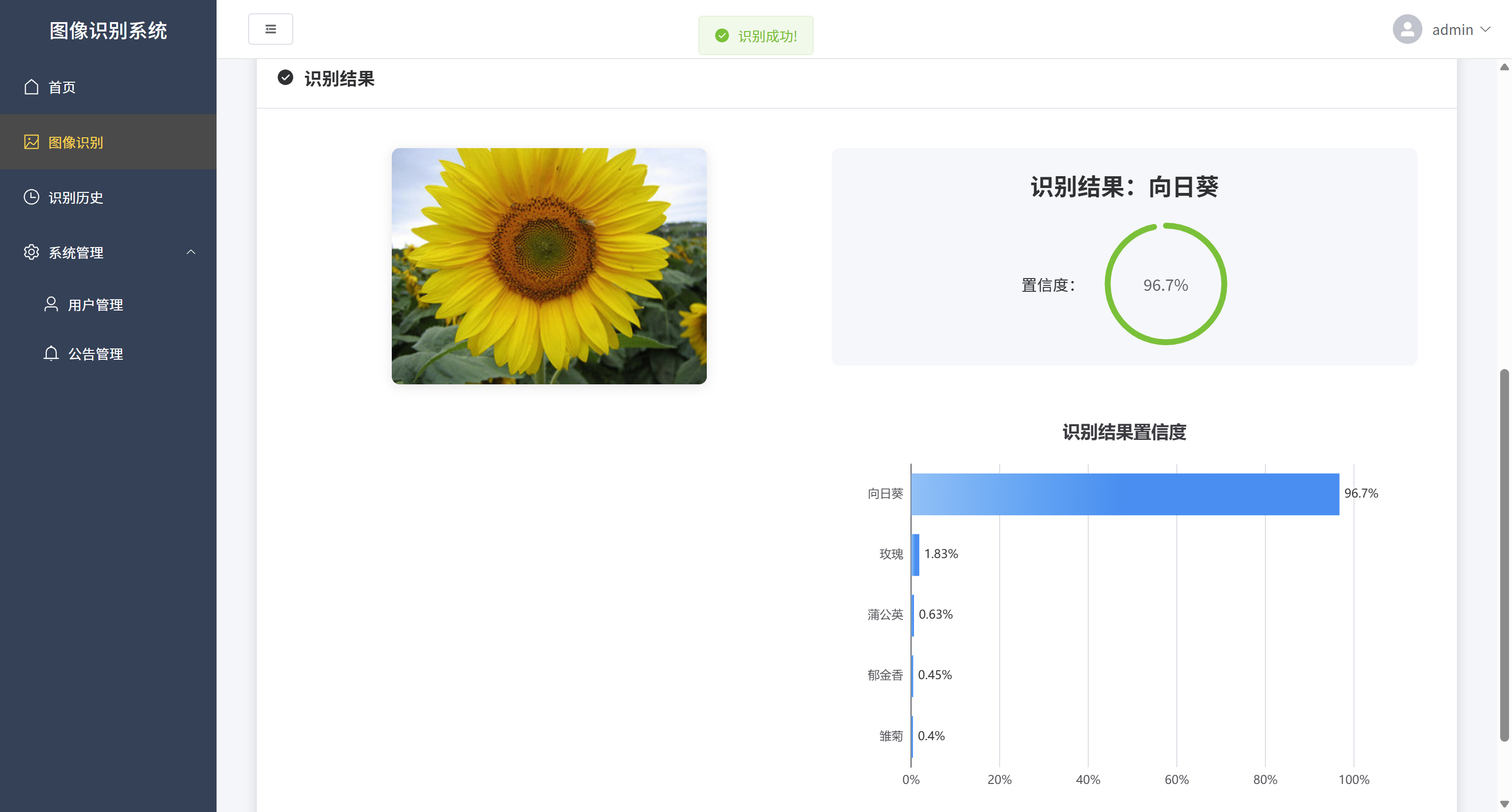 核心识别功能基于TensorFlow深度学习框架和ResNet50预训练模型实现。通过对大量花朵图像数据的训练和优化,系统能够识别超过100种常见花朵品种,识别准确率达到90%以上。用户只需上传一张花朵图片,系统将在几秒钟内返回识别结果,包括花朵名称、置信度和详细信息。