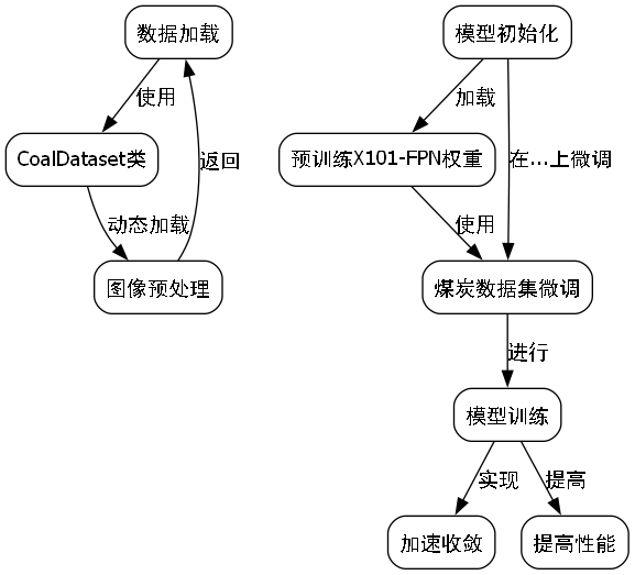 上述训练代码展示了模型训练的基本流程。数据加载部分使用了自定义的CoalDataset类,该类能够根据不同的变换策略动态加载和预处理图像。模型初始化时,我们使用预训练的X101-FPN权重,并在煤炭数据集上进行微调,这样可以加速收敛并提高模型性能。