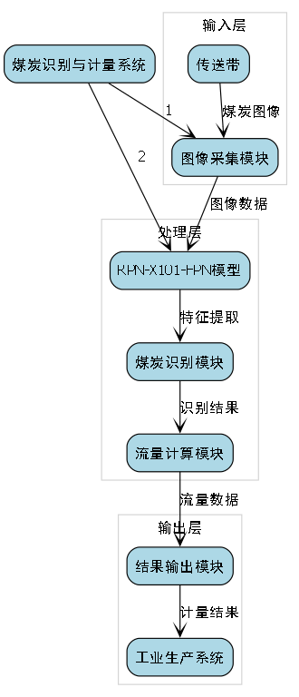 本系统主要由图像采集模块、预处理模块、煤炭识别模块和计量模块四部分组成。图像采集模块负责获取传送带上煤炭的实时图像;预处理模块对原始图像进行增强和标准化处理;煤炭识别模块采用改进的RPN-X101-FPN模型对煤炭进行精确识别;计量模块则根据识别结果计算煤炭流量。