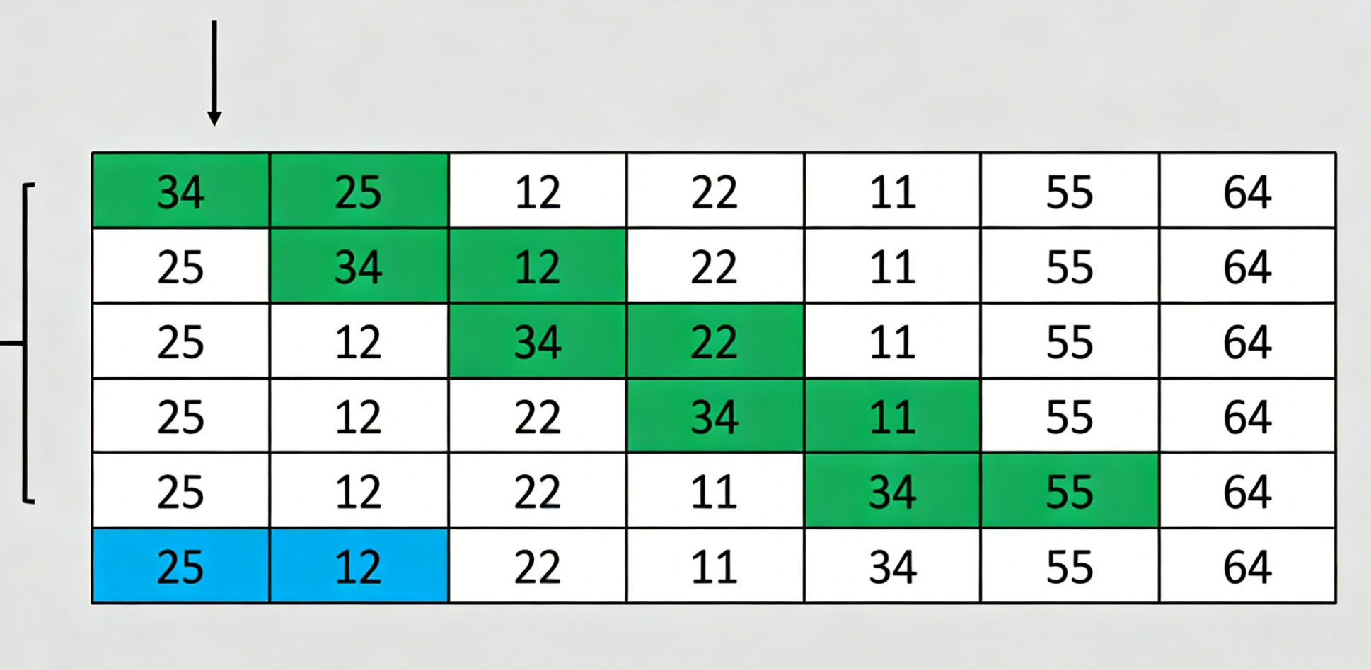 - 比较64和25:64>25,交换 → [34, 25, 64, 12, 22, 11, 55]