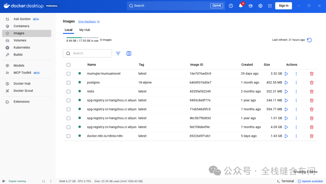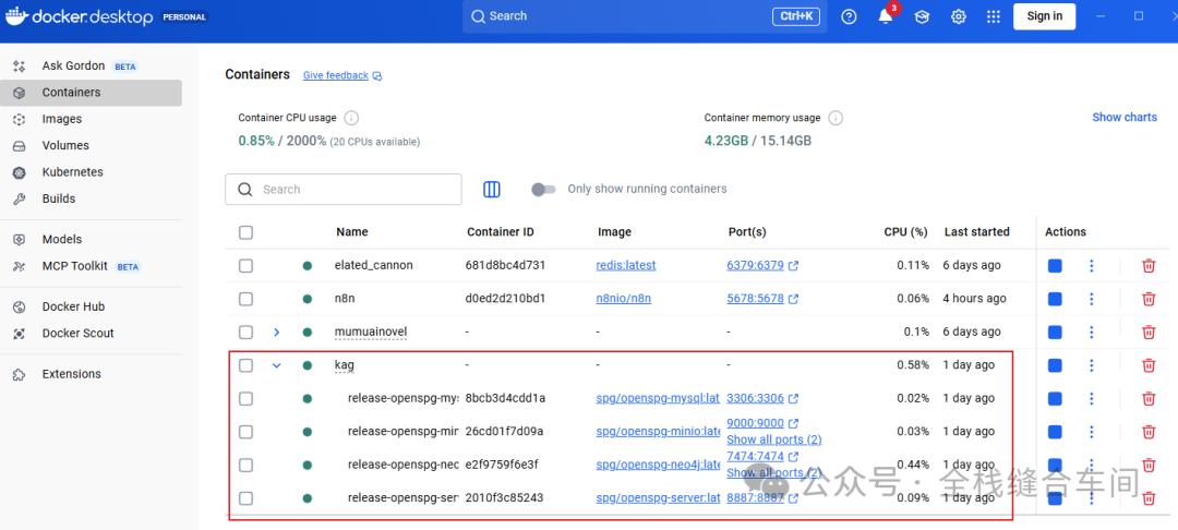 因为我之前安装过了,所以安装过程就不复现了,安装完成后的docker容器是这样的: