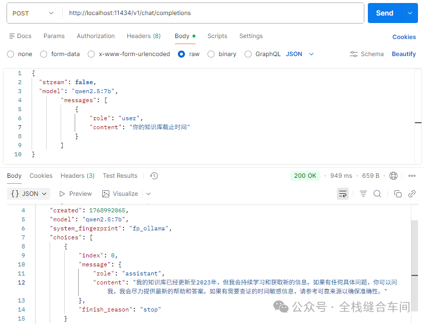 curl --location 'http://localhost:11434/v1/chat/completions' \--header 'Content-Type: application/json' \--data '{ "stream": false, "model": "qwen2.5:7b", "messages": [ { "role": "user", "content": "你的知识库截止时间" } ]}'