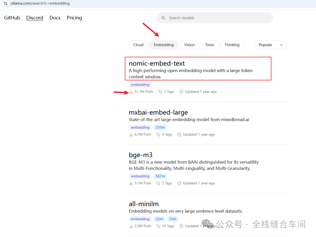 我们进到ollama的向量模型列表:https://ollama.com/search?c=embedding
