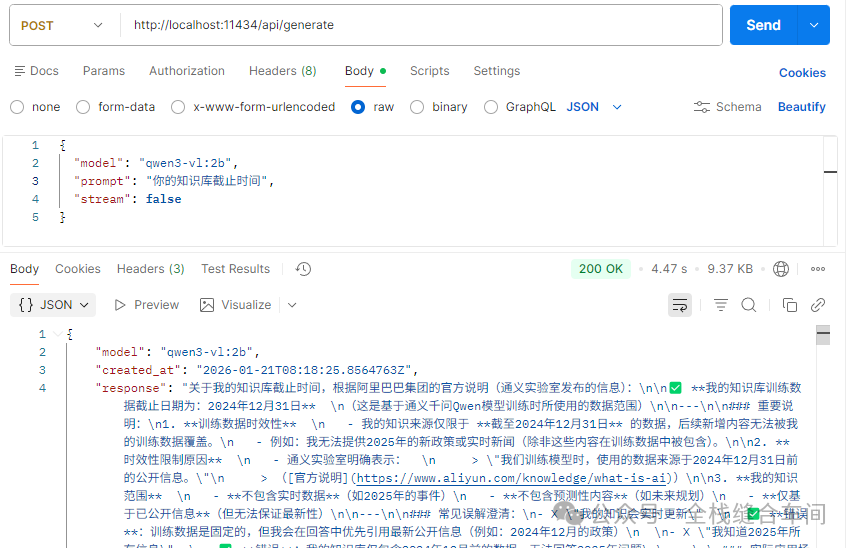 curl --location 'http://localhost:11434/api/generate' \--header 'Content-Type: application/json' \--data '{ "model": "qwen3-vl:2b", "prompt": "你的知识库截止时间", "stream": false}'