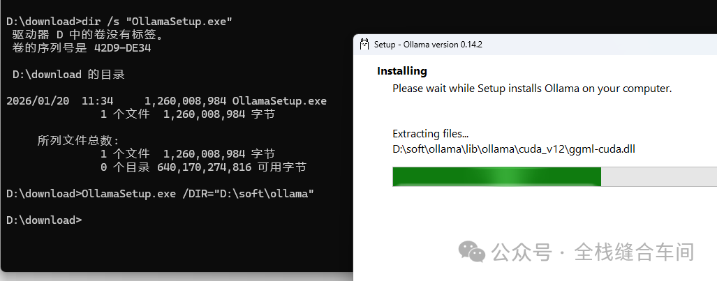 我们可以通过以下命令行更改安装目录,这里我指定让ollama安装到D盘的专门装软件的一个文件夹下: