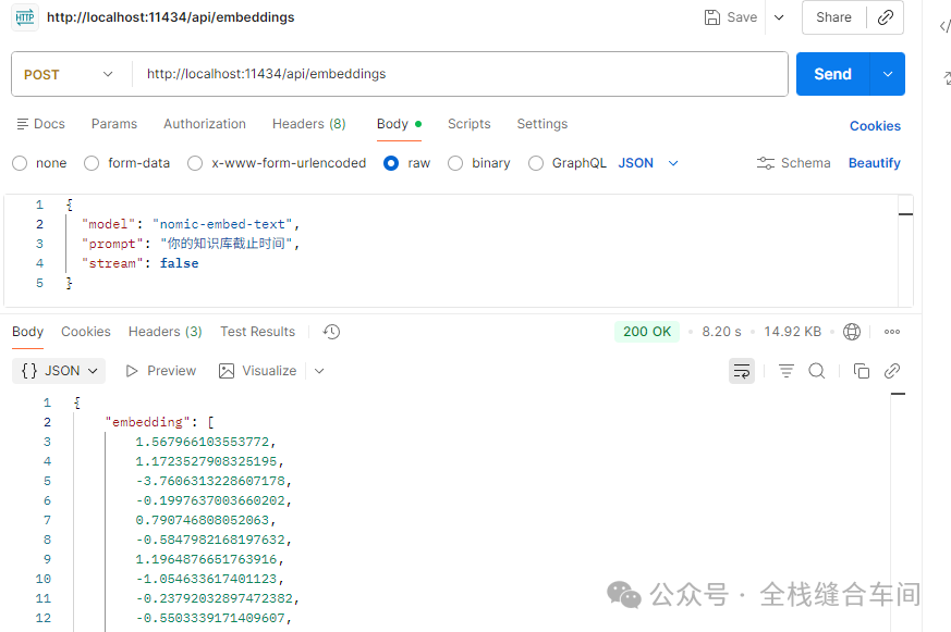 curl --location 'http://localhost:11434/api/embeddings' \--header 'Content-Type: application/json' \--data '{ "model": "nomic-embed-text", "prompt": "你的知识库截止时间", "stream": false}'