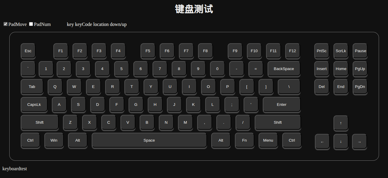<p><input type="checkbox" id="check_padmove" checked>PadMove <input type="checkbox" id="check_padnum" checked>PadNum <span id="info">key keyCode location down/up </span></p>