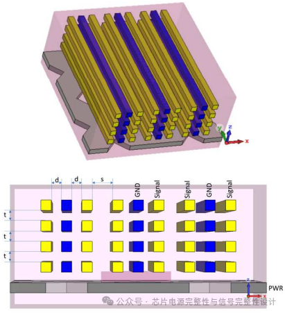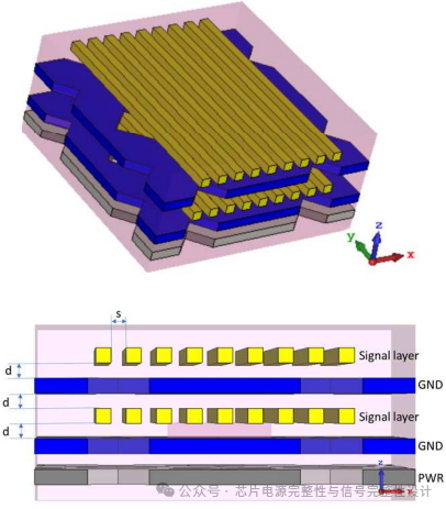 图2:第二种拓扑结构------5层HDFOLWP堆叠的三维视图和横截面视图;s为相邻信号线间距;d为信号与地间距;顶层四层采用GSS模式,第五层为电源。