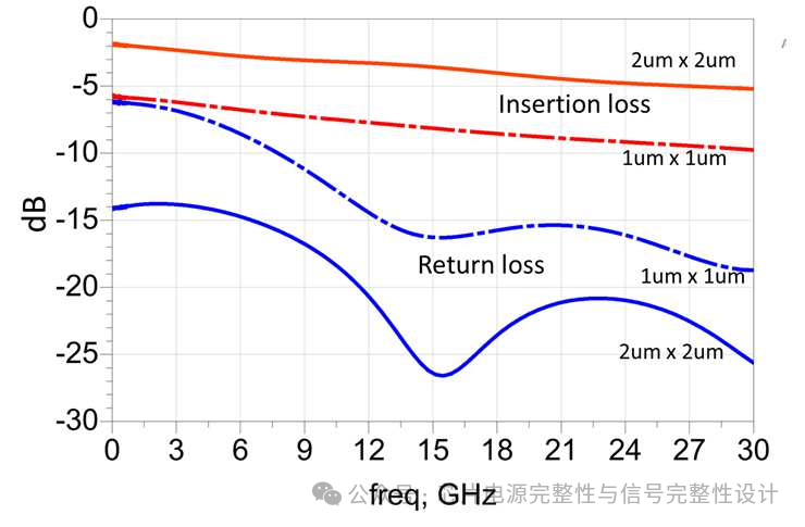 图7:拓扑二中2um×2um和1um×1um导线的回波损耗与插入损耗。