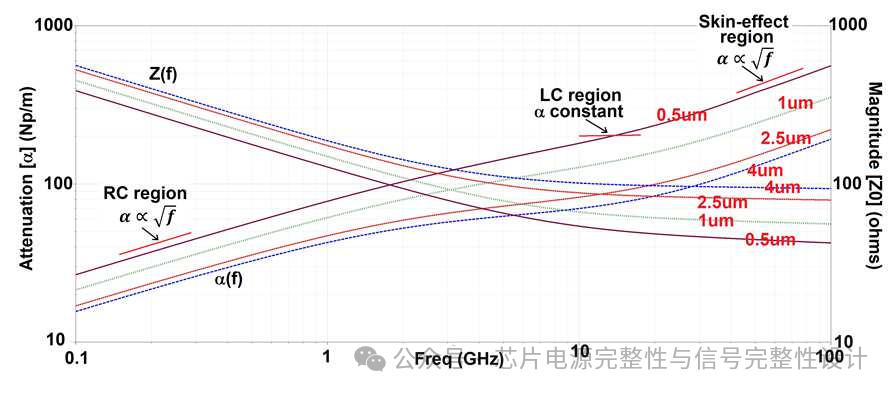 细截面互连的直流电阻极高(如2um×2um铜线电阻约4.31Ω/mm,1um×1um线电阻增至四倍)。需通过衰减曲线和频率变化分析其特性。
