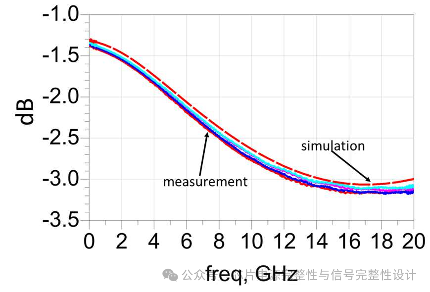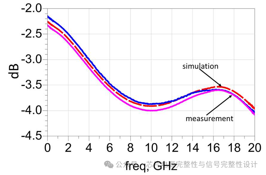 图8:3mm长2um×2um导线的插入损耗------仿真与实测对比。