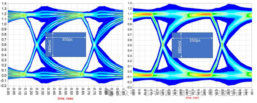 图11:拓扑一(左)和拓扑二(右)采用1um×1um导线的AIB接口眼图。