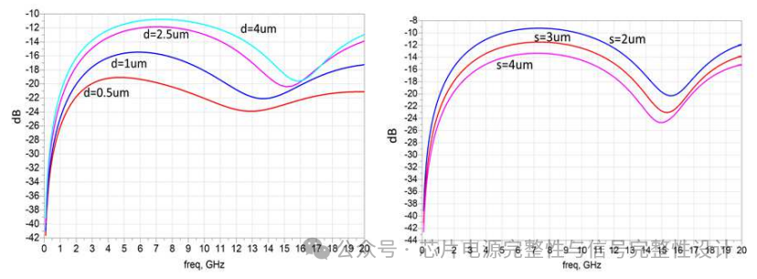 图14:2um×2um导线在拓扑一顶层的耦合变化:左(仿真)------固定线距s=2um,调整地间距d;右(实测)------固定d,调整s。