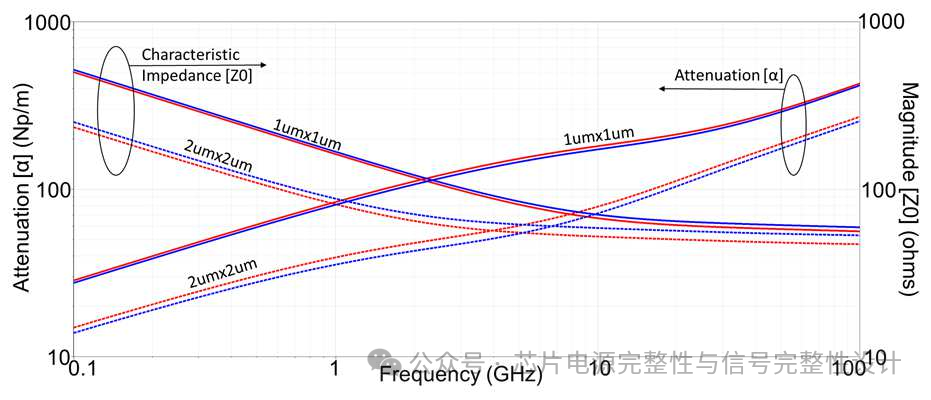 图5:1um×1um(实线)和2um×2um(虚线)导线在拓扑二中随频率的衰减和特性阻抗变化。