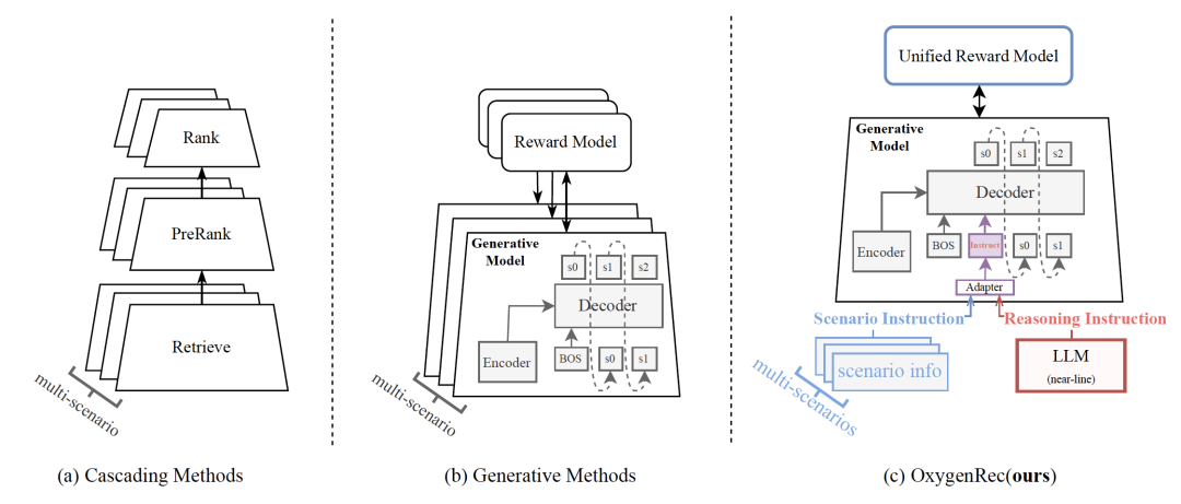 在电商推荐系统中,推荐模型长期面临着两个核心矛盾:一方面,传统的多阶段级联推荐系统存在目标不一致和误差累积的问题;另一方面,直接引入大型语言模型LLM虽然能带来强大的推理能力,但其高昂的延迟和计算成本在工业级应用中难以承受。更重要的是,现有的生成式推荐方法在多场景扩展性上面临巨大瓶颈--每个场景都需要独立训练和部署,导致资源利用率低下、维护成本高昂。