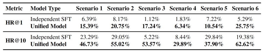 - 统一模型 vs. 独立模型:在六个核心场景的对比中,统一的OxygenREC模型全面超越了为每个场景独立微调的基线模型,验证了OxygenREC框架在场景间正向迁移的有效性。