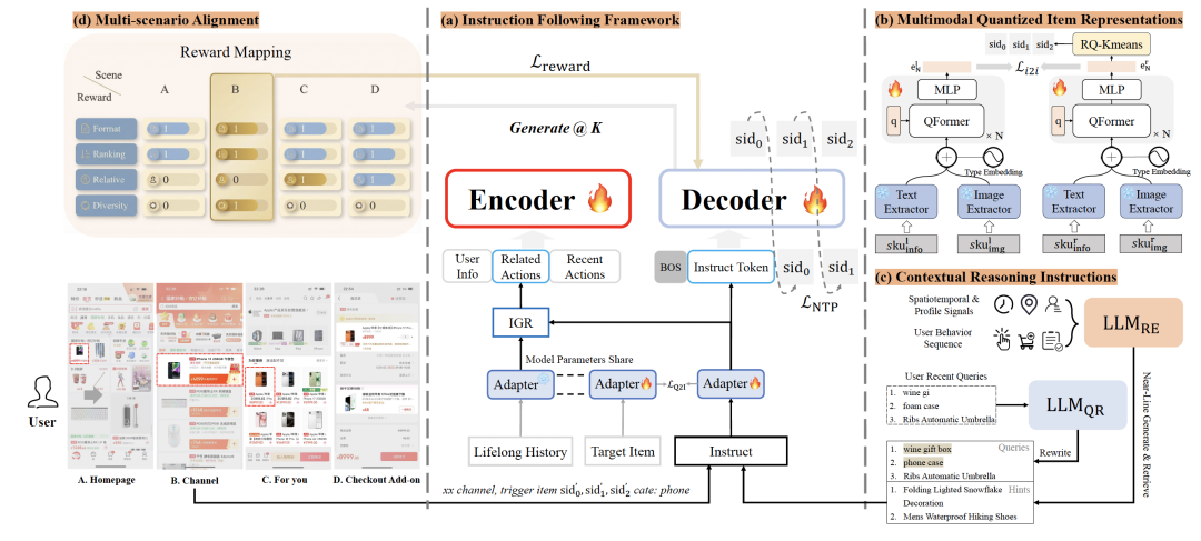 场景指令化 :将不同的场景信息(如首页、购物车)和可选的触发物品(如用户点击的入口商品)统一编码为****"场景指令"****,作为模型的条件输入。