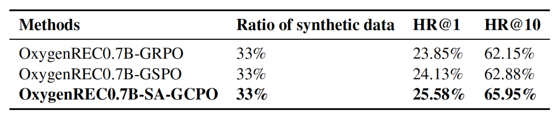 在后续训练阶段,提出的SA-GCPO算法在合成数据比例变化时表现更稳定,且性能显著优于传统的GRPO及其变体GSPO。例如,在33%合成数据比例下,SA-GCPO在HR@1和HR@10上有显著提升。