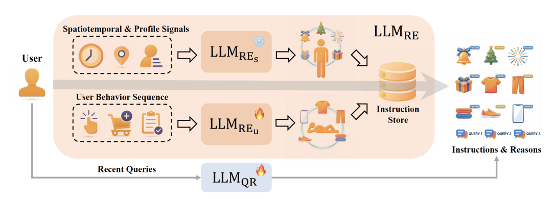 慢思考 :一个近线的LLM pipeline,综合分析用户的时空上下文、个性化特征和历史行为,生成高质量的****"上下文推理指令"****。这个过程融合了世界知识,能进行深度演绎推理,但因其是近线批量处理,不增加在线请求的延迟。