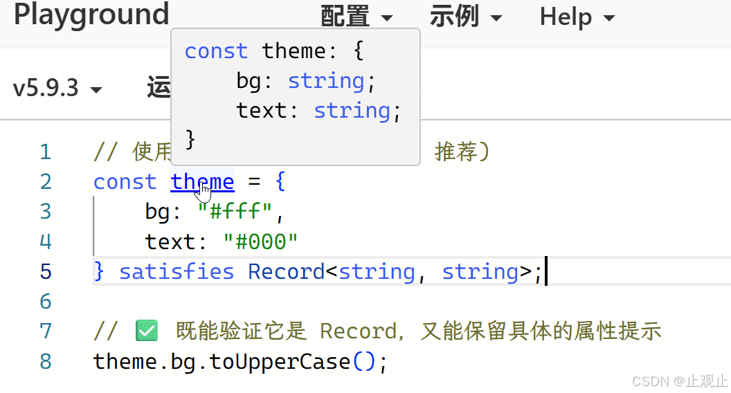 为了让大家提前感受现代 TS 的魅力,我们简单看下 TS 中最常用的算子之一:satisfies(我们后续文章会详解)。