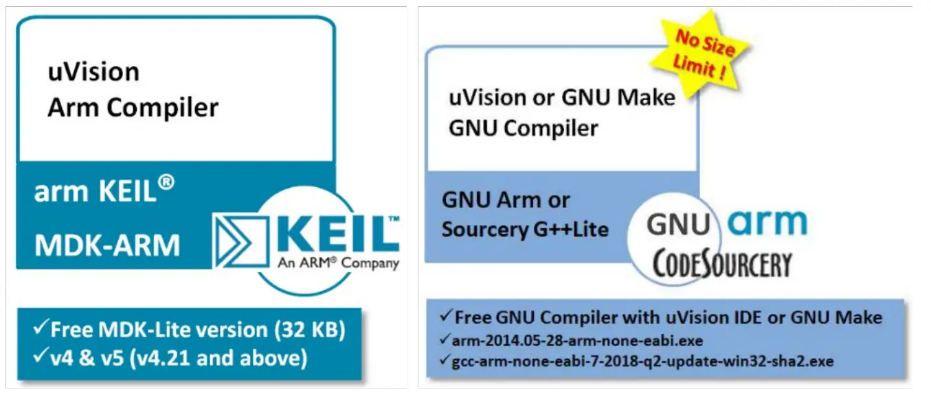 | 典型工具链 | Arm Compiler, Keil uVision, Arm DS | GNU GCC, arm-none-eabi-gcc, Clang/LLVM |