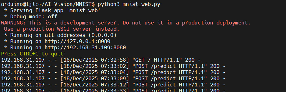 终端执行指令 python3 mnist_web.py 输出网页服务器地址等信息