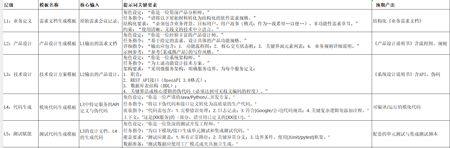 AI生成质量的高度依赖于输入的提示词质量。我们需要建立一套标准化的分层提示词模板库,确保从需求到代码的生成过程具备一致性、可追溯性和高质量。