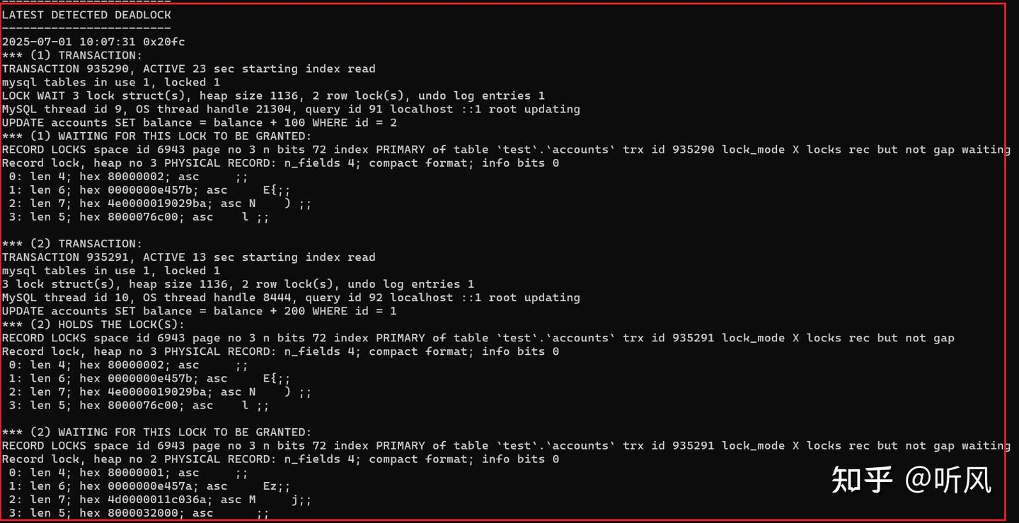 输出中包含 LATEST DETECTED DEADLOCK 部分,显示死锁事务的详细信息: