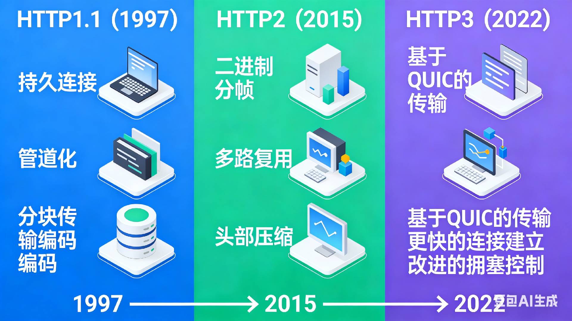 一、三代HTTP协议核心技术演进对比