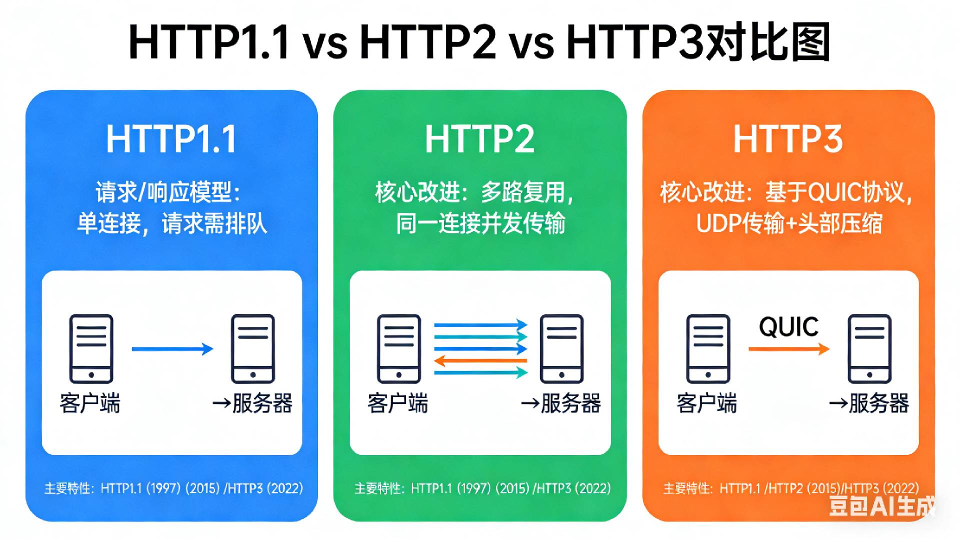 | 对比维度 | HTTP/1.1 | HTTP/2 | HTTP/3 (基于QUIC) | 收益分析与演进意义 |