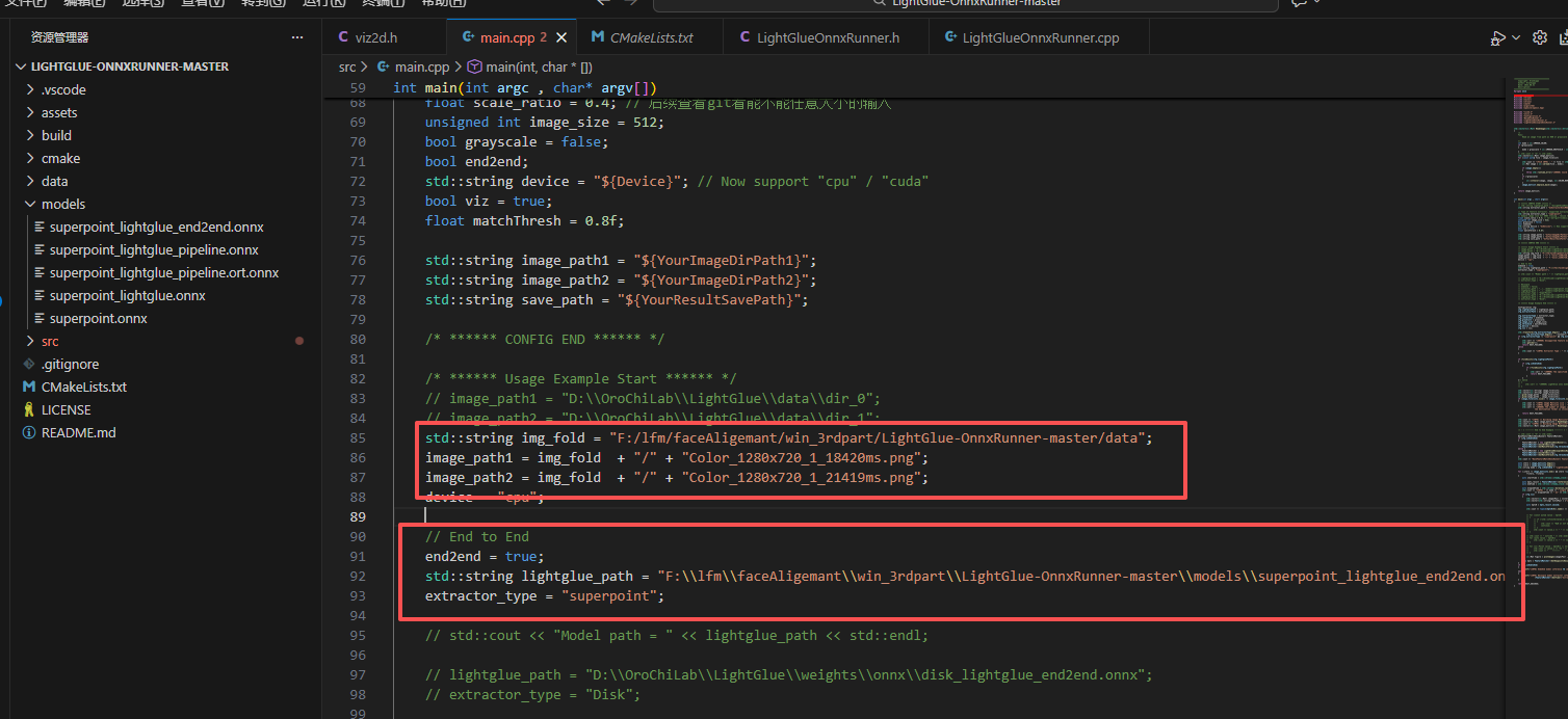 解决以上问题后顺利跑通,但是还有几个问题待解决:LightGlue pytorch源代码学习、onnx模型导出与导入。项目后续:结合mask作特征点标定...