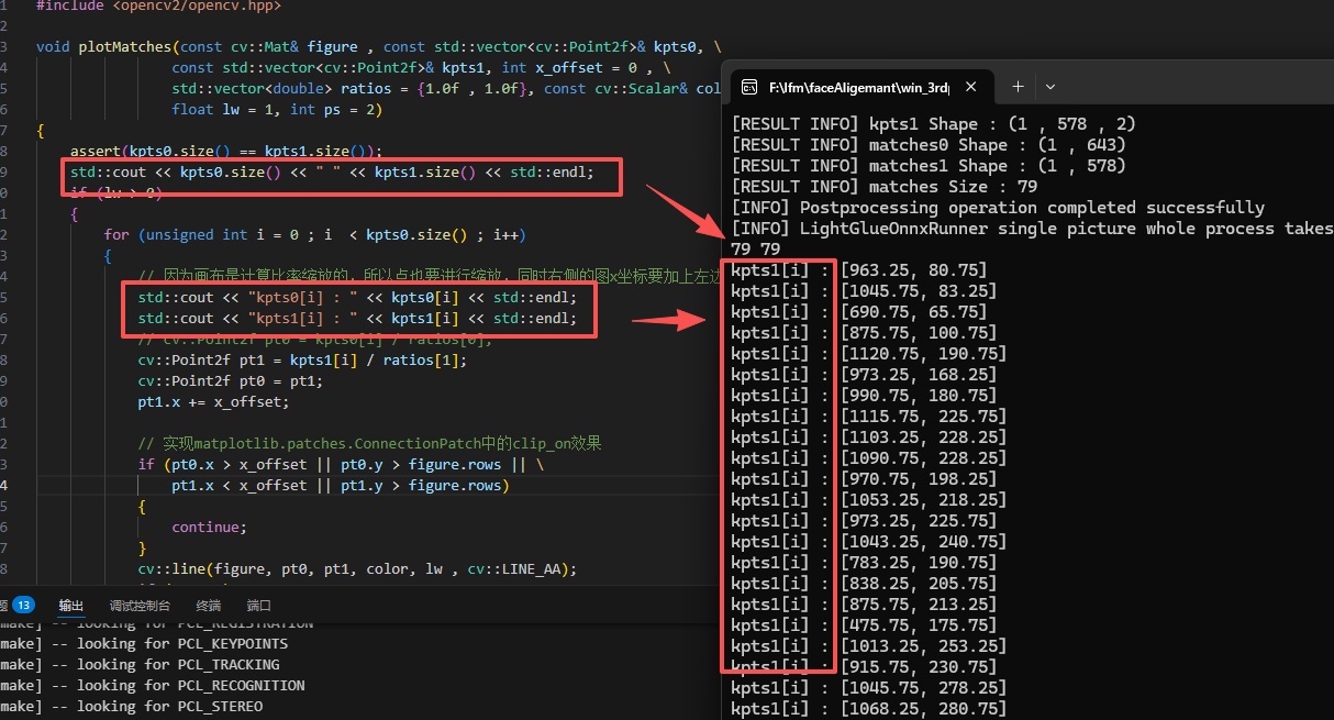 viz2d.h/plotMatches函数内一直获取不到kpts0的值。在上层打印数据类型显示为cv::Point<float>同时size != 0。后续在上层打印也打印不出,直到使用cv::Point变量接受kpts[i]中的值才解决