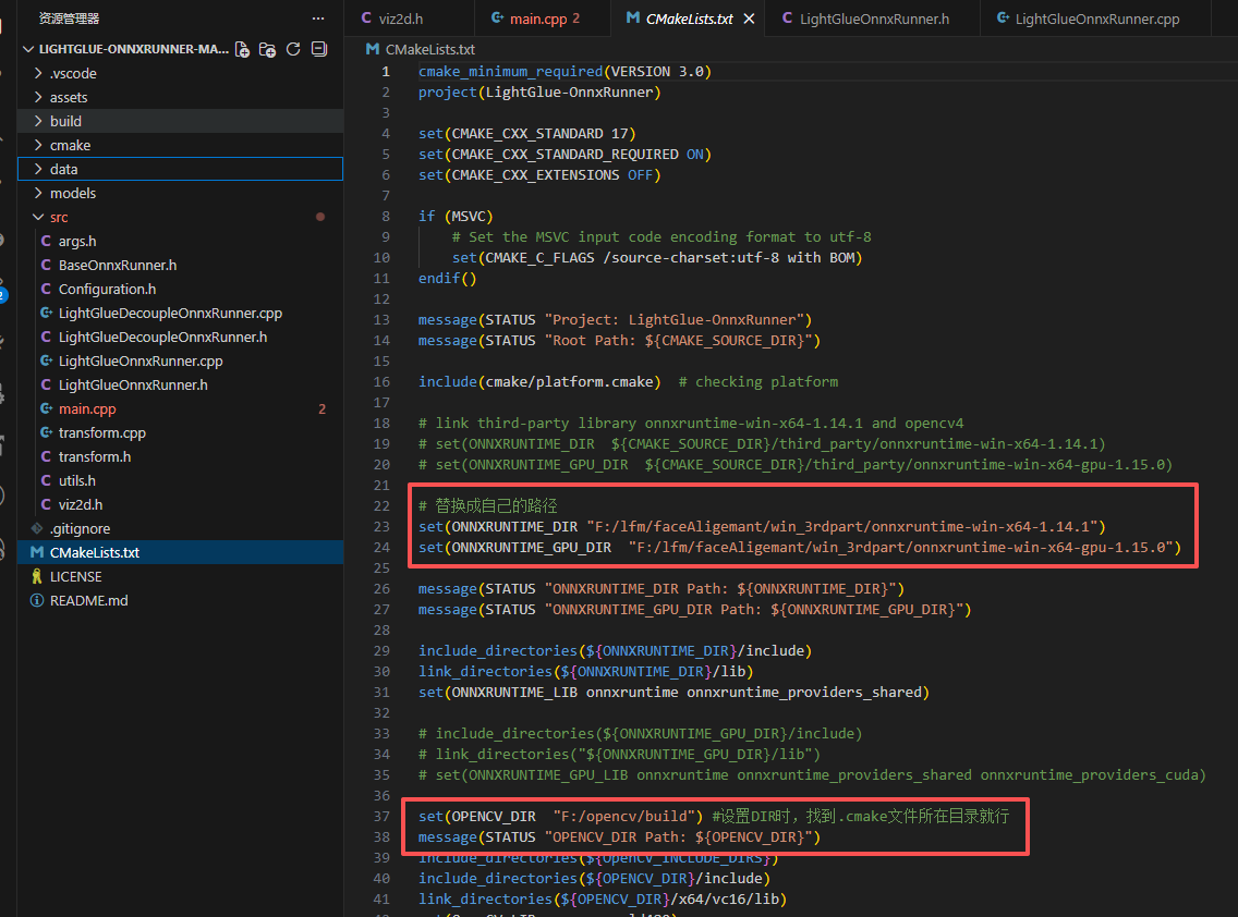 下载后解压进入onnx模型文件夹打开CMakeLists.txt,修改对应的库路径-->包含头文件-->链接lib。