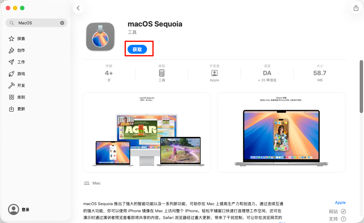 打开Apple Store,搜索 MacOS ,点击 下载macOS版本