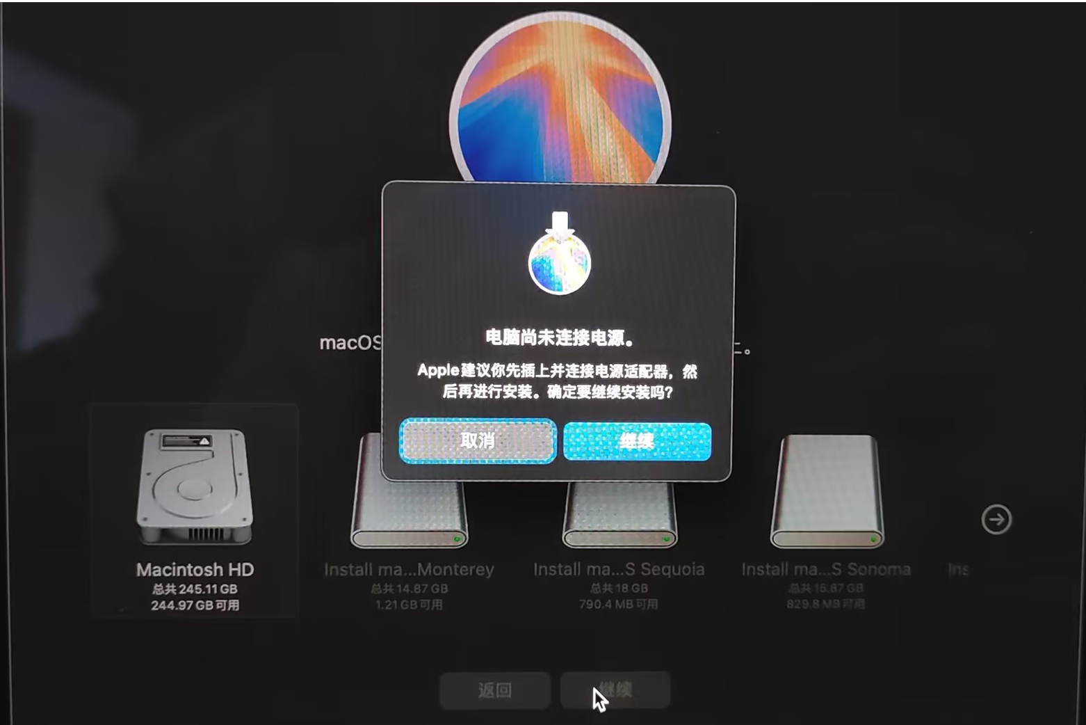 如果没有接入充电器此时会弹出相关提示(最好安装系统期间接好电源 ),并且下一步在安装系统过程中要是不连接网络,也会失败,把网络需要连接上 (拓展坞接网线或者右上角连接WIFI都行)
