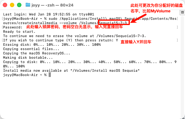接着会提示To continue we need to erase the volume at /Volumes/Sequoia15-7-3.If you wish to continue type (Y) then press return: