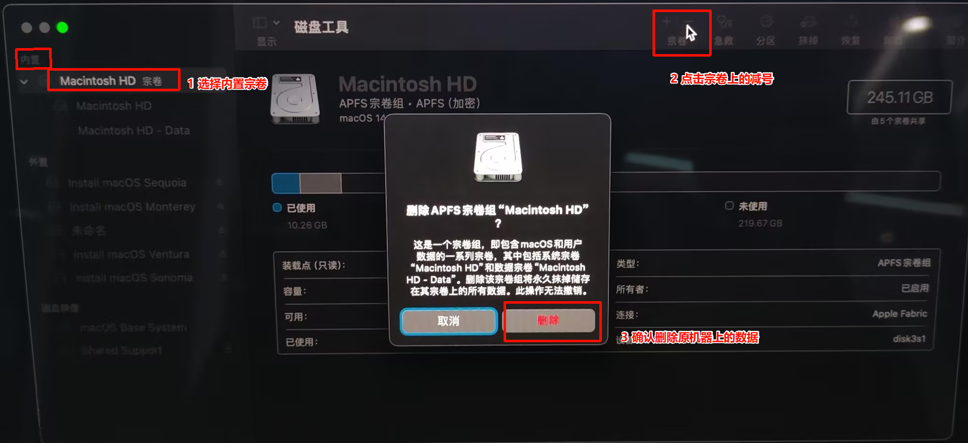 选择内置里的磁盘,再点击宗卷的减号,确认删除原宗卷里的内容