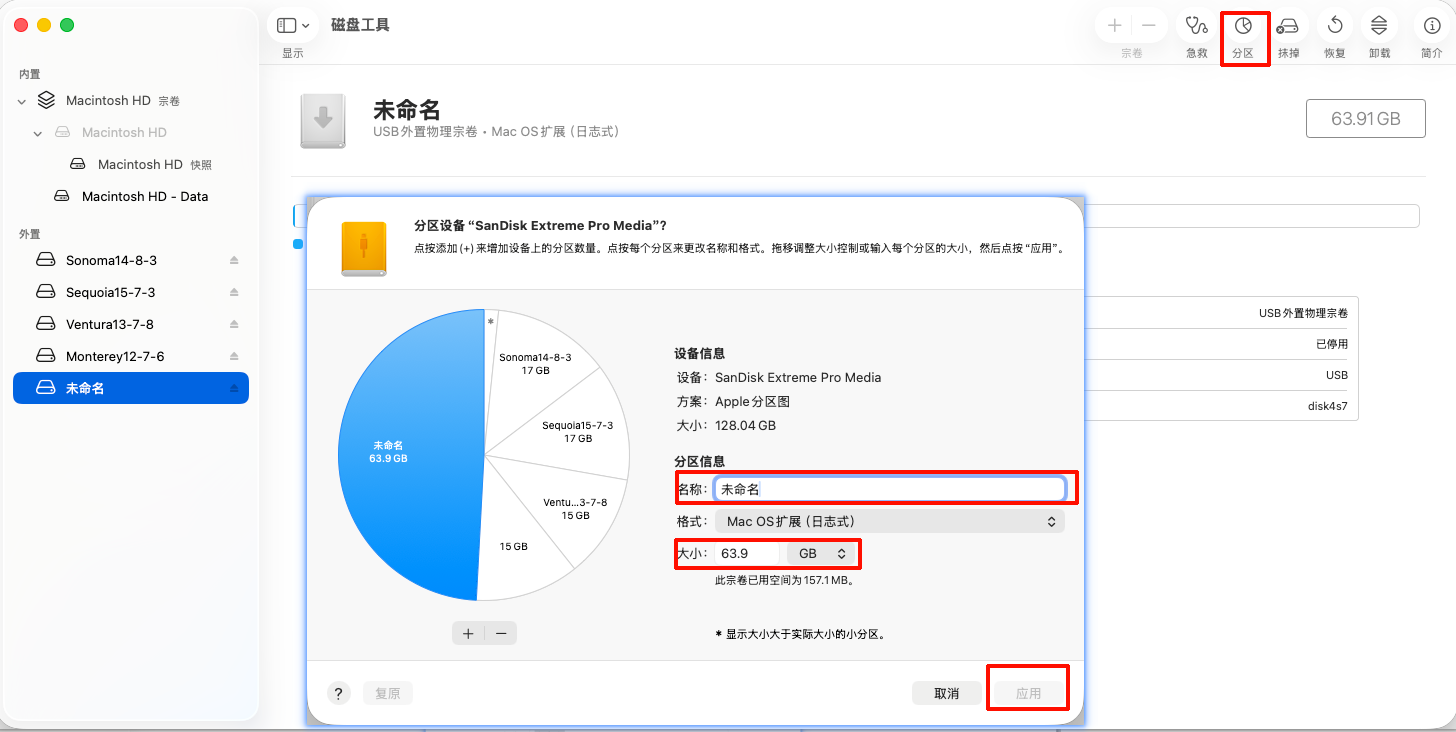 大小划分可参考MacOS各版本名称及大小,实际大小需要根据情况调整(大小的话,建议起码16G,最好20G及以上。因为我想着省点空间,一开始就给个15G,结果写入安装器的时候提示空间不足了额,也没多大事,就是重新分下区)