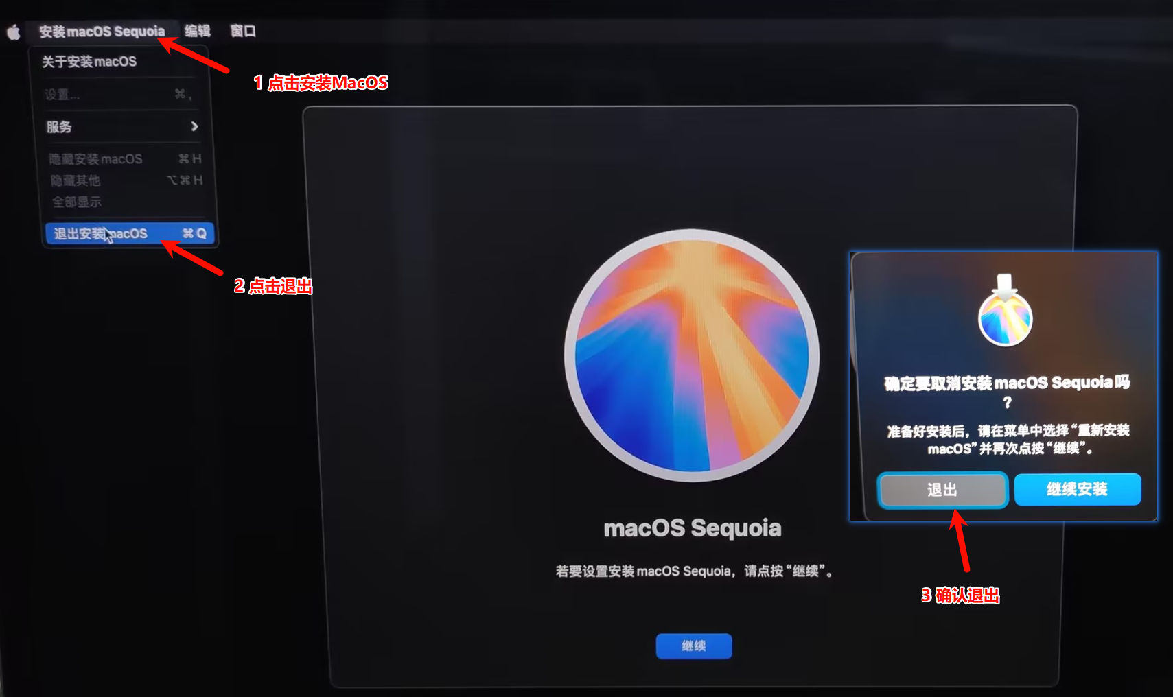进入到安装界面先不着急,先点击左上角选择退出安装MacOS