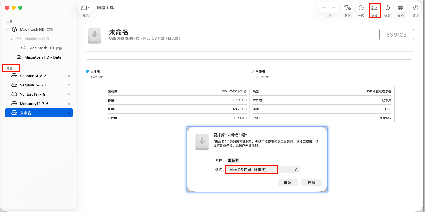 按下command+空格,搜索磁盘工具,在左侧外置一栏U盘应该能看到我们的U盘,点击选中,然后在右上角选择抹除,格式选择MacOS拓展(日志式)。若无制作多合一启动盘的需求,此步可直接更改名称为MyVolume