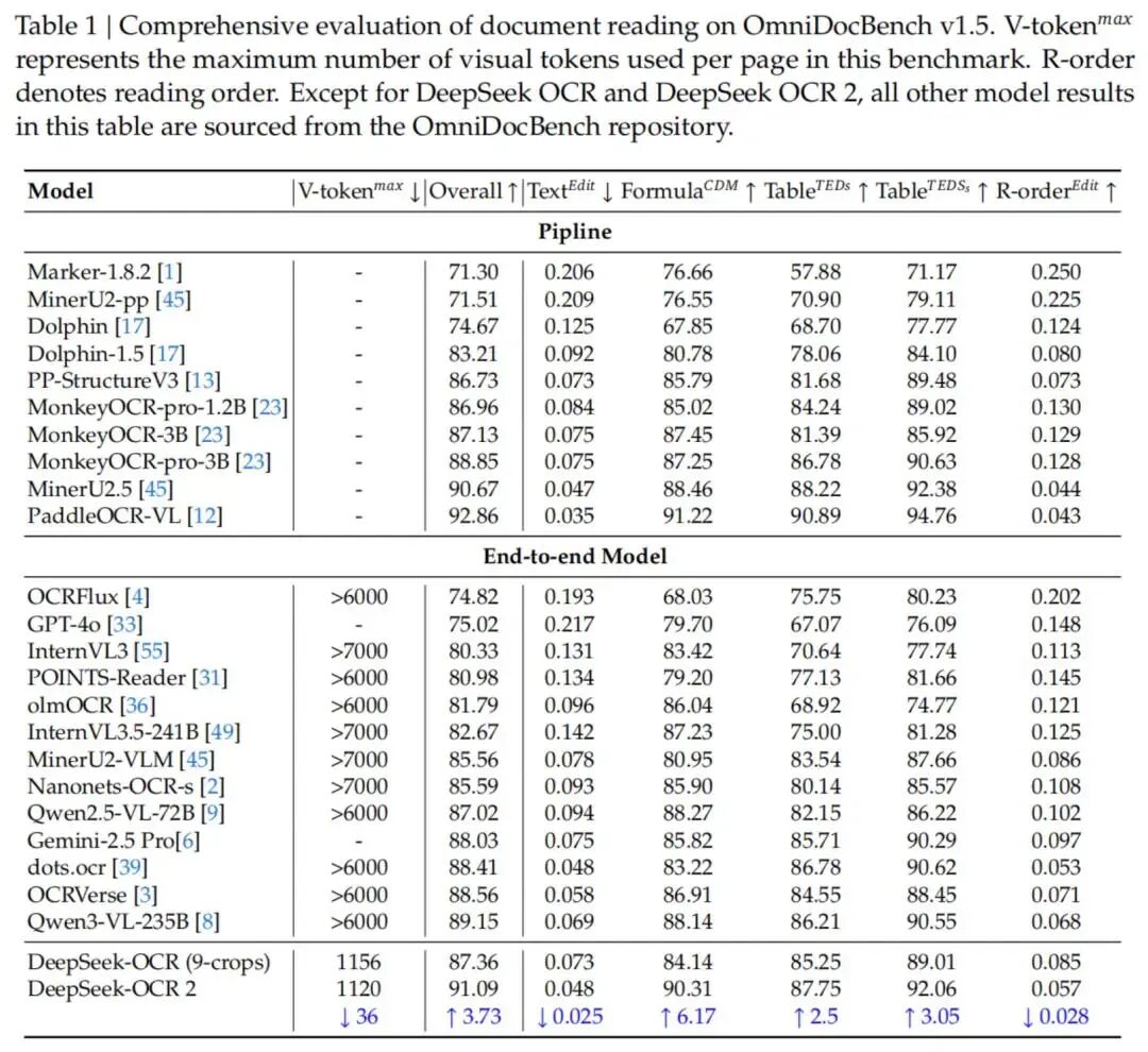 在OmniDocBench v1.5等权威测试中,DeepSeek-OCR 2展现了优异性能,据称超越了GOT-OCR2.0等主流模型。