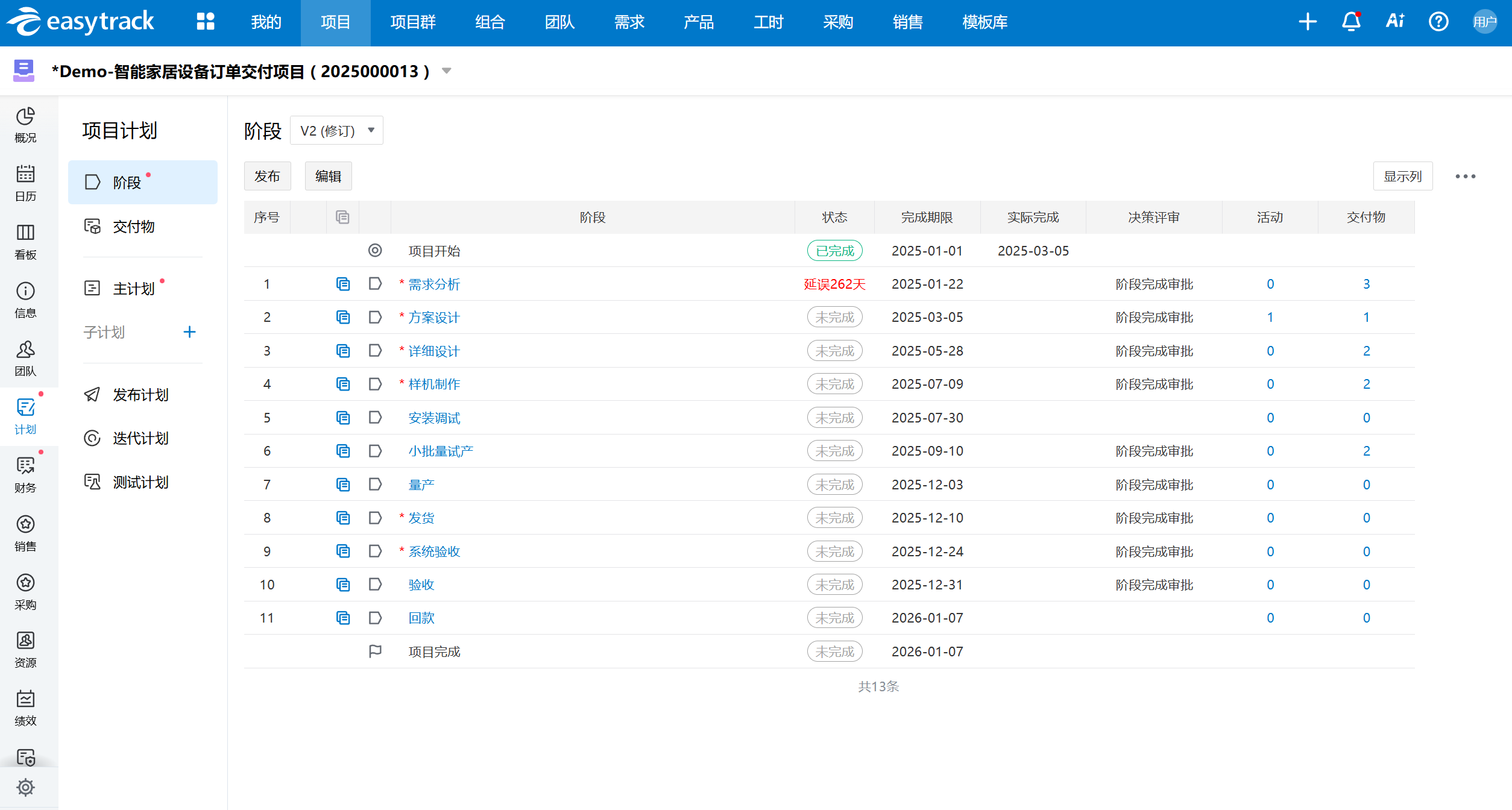 易趋项目运营管理平台提供里程碑计划监控功能,项目经理可实时跟踪关键节点的完成情况,及时发现偏差并采取措施进行调整,确保项目按计划推进。