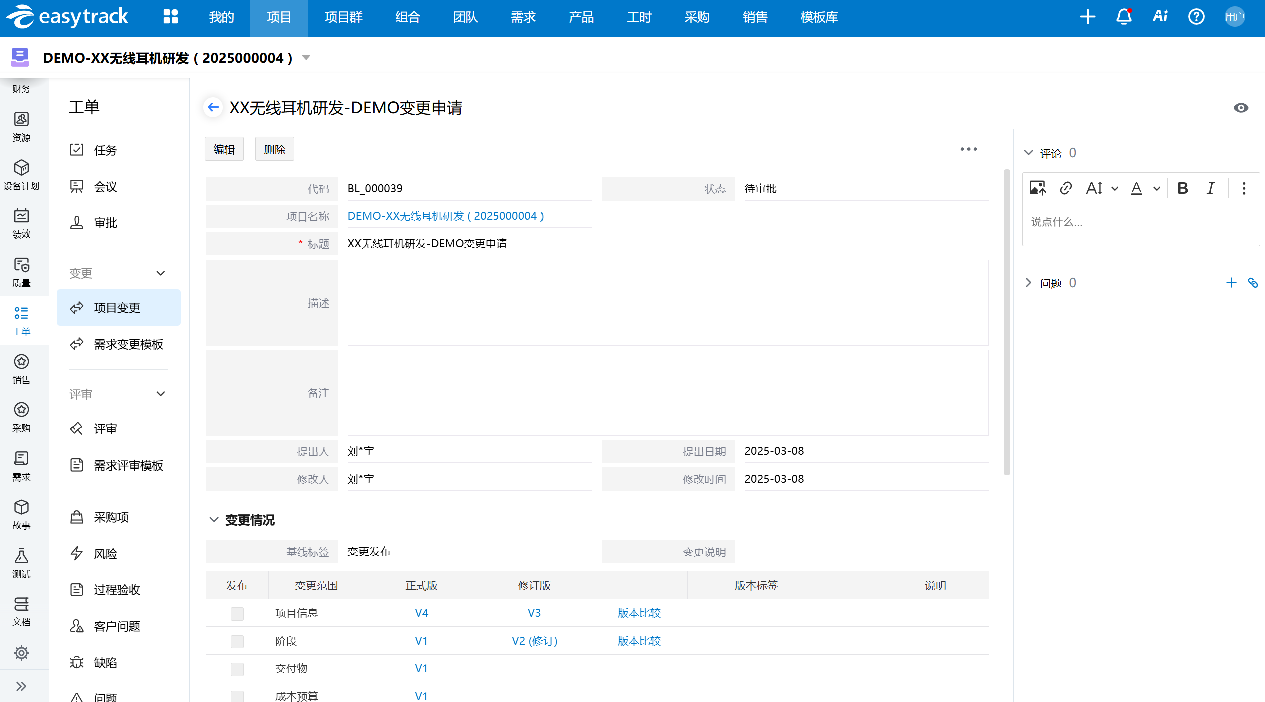 易趋项目运营管理平台支持项目变更的线上流程化管理,所有变更申请均需经过严格的审批流程。通过这种方式,可有效避免变更失控导致项目范围扩大的情况,确保项目始终处于可控状态。