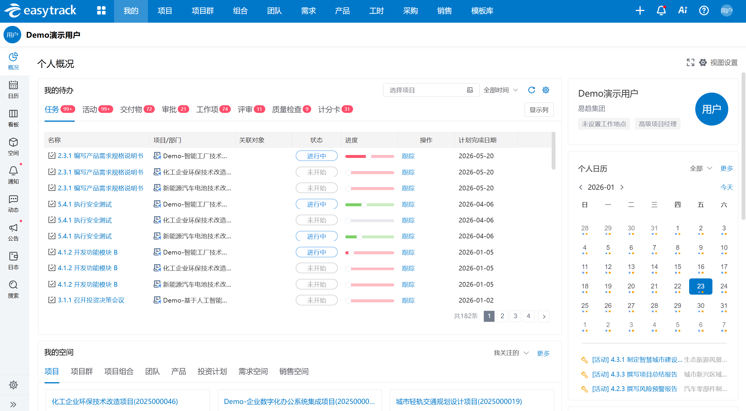 易趋项目运营管理平台为不同角色提供了专属驾驶舱,各角色可直观查看所关注的数据。如管理层可查看各项目整体进展和关键指标,项目经理可以查看所负责的项目进度、交付物完成情况,团队成员可查看自己的任务安排和进度。通过统一的管理平台,减少了沟通时的数据不同步问题,提高了沟通效率。