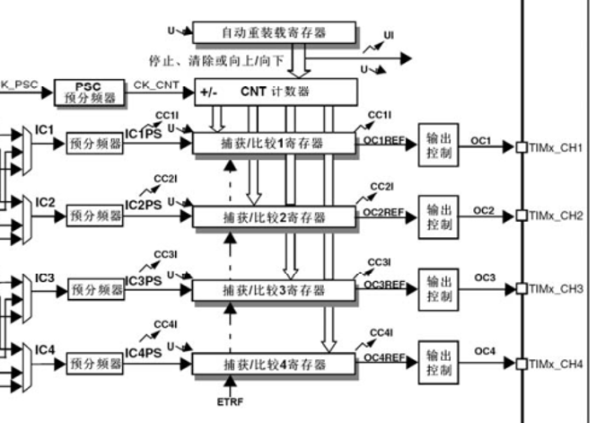 CC1E(TIMx_CCER寄存器位)控制的输出使能电路。只有当CC1E=1时,信号才能通过并最终从OC1引脚输出;CC1E=0时,通道输出会被关闭。OC1 经过复用功能(AF) 路由后,到达具体的 GPIO 口。 -