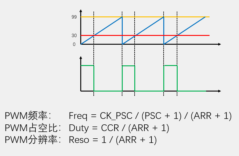 - 当比对结果为CNT≥CCR 时,输出无效电平;随 CNT 完成 0→ARR→0 的循环,电平按此规则重复切换,形成连续的 PWM 波形。