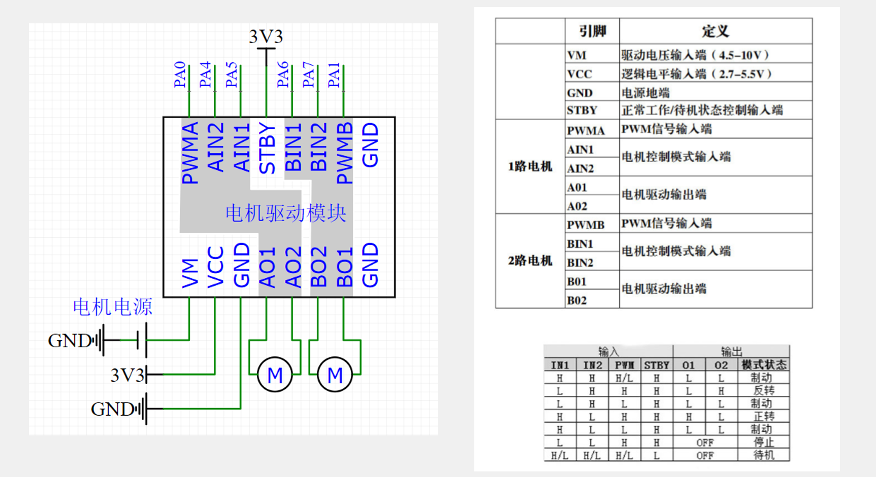 停止:AIN1=L,AIN2=L 且 PWM=L → 电机无供电,自然停转。