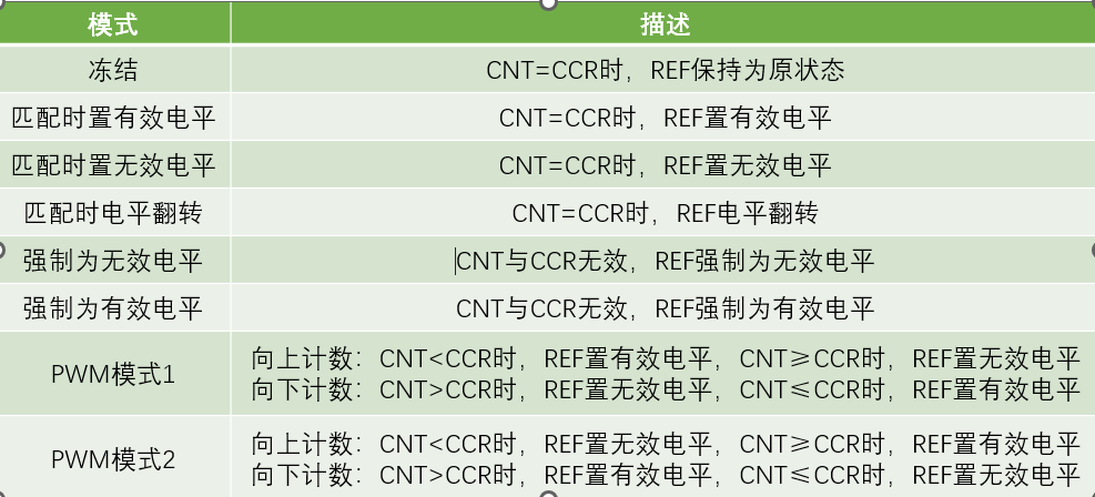 CNT > CCR1、CNT = CCR1),并根据TIMx_CCMR1寄存器里的OC1M[2:0]位配置,生成原始参考信号OC1REF。这个信号决定了 PWM 的基础波形。 -