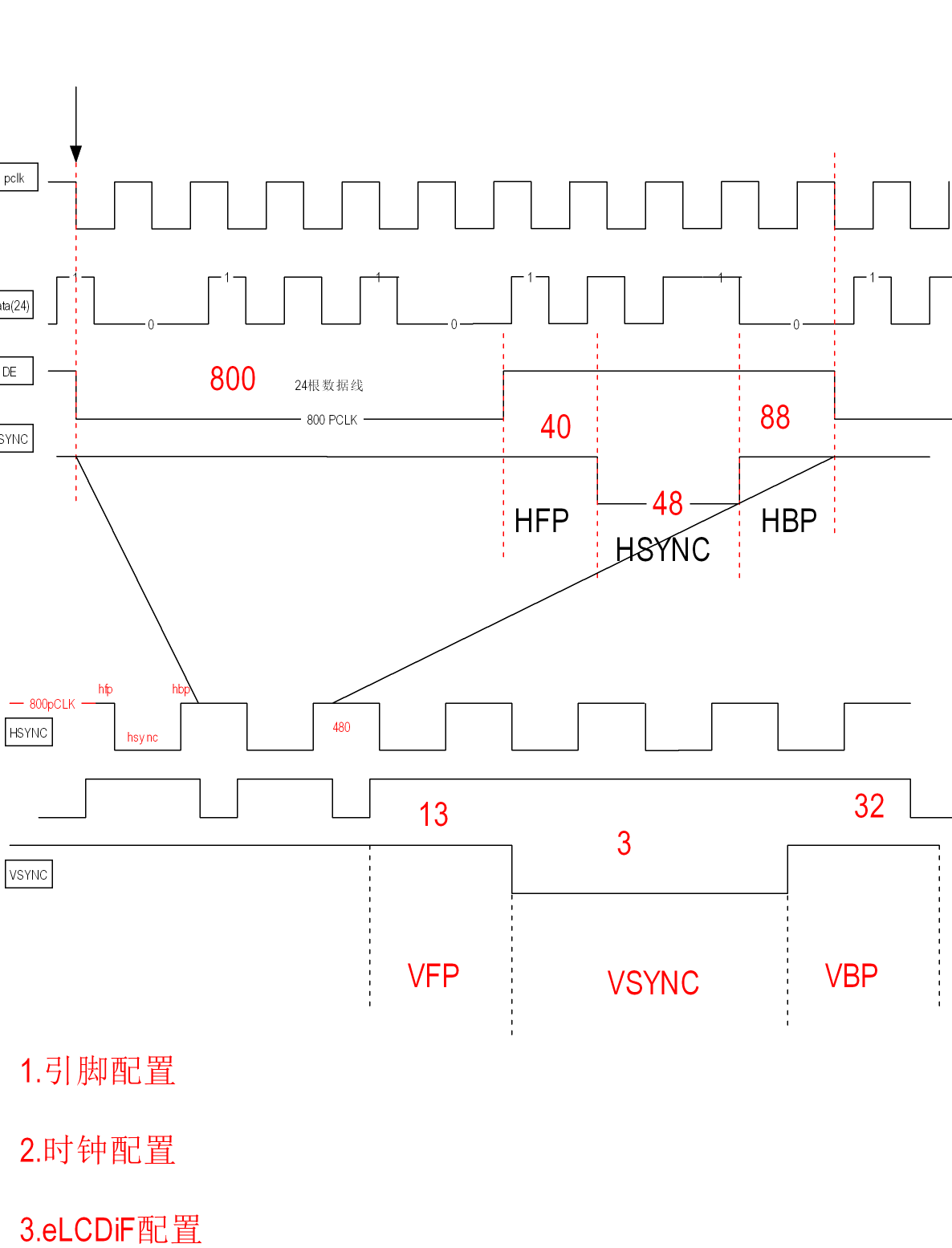 垂直方向(帧)的时序定义同理,包含VBP、有效行数、VFP和VSYNC Pulse Width。