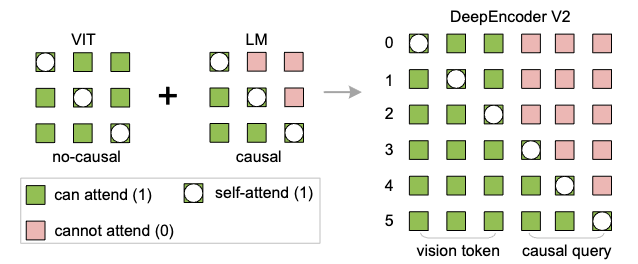 因此,DeepEncoder V2在除了保留视觉Token之外,加入了可学习的序列(learnable query),并使用因果注意力(causal)。